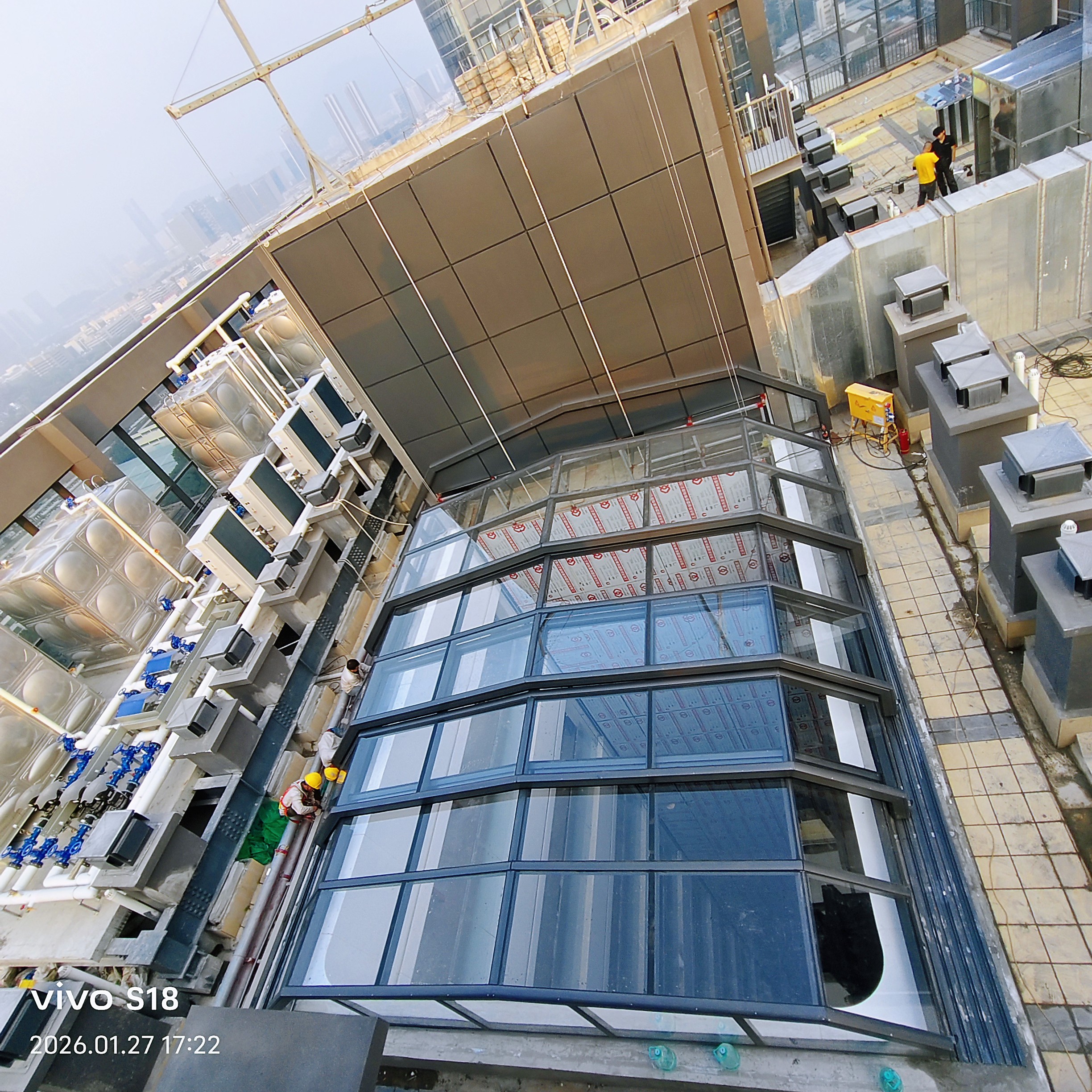 深圳唐商大厦的可开启屋面系统,经过综合评估与客户深度沟通,最终选用钢化夹胶玻璃作为面板材料,而非轻质的PC板材。这一决策源于客户对材料耐久性、视觉质感与长期性能的高度重视。客户尤为认可玻璃表面优异的抗刮擦特性,其高透光与细腻质感能够显著提升建筑视觉效果,且经得起时间考验——即便在十年后,仍能保持通透光泽,历久如新。唐商大厦的选择,也与Sunrim在类似高端项目中的实践经验相符:在注重品质与可持续性的场合,我们亦会建议采用玻璃材质,以兼顾结构安全、美学表现与长效运维。该项目体现了从客户需求出发、以长期价值为导向的材料选择逻辑。